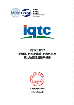近日,廣紡檢測收到廣州海關(guān)技術(shù)中心組織的IQTC24P12紡織品耐唾液色牢度和IQTC24P07紡織品耐水色牢度能力驗(yàn)證計(jì)劃結(jié)果報告,結(jié)果均為滿意!